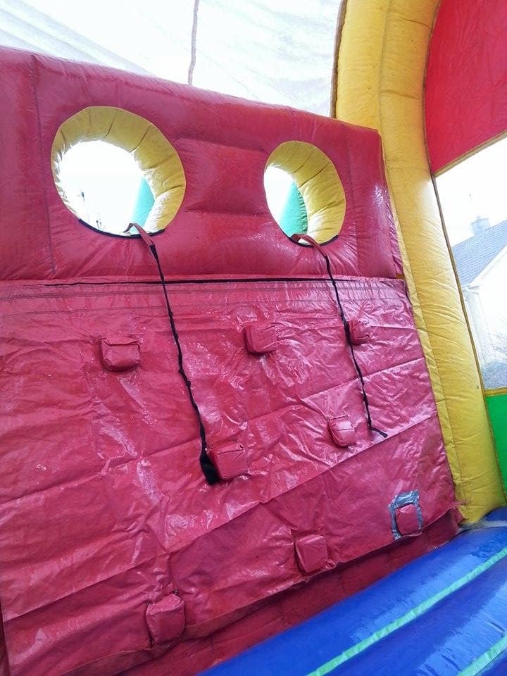 Large 20ft x 20ft unit with 12ft twin slide extending to the side. This unit has a climbing wall inside and a large bouncing area. Suitable for kids and adults it will provide endless hours of fun for all the family. Comes with raincover and safety mats..