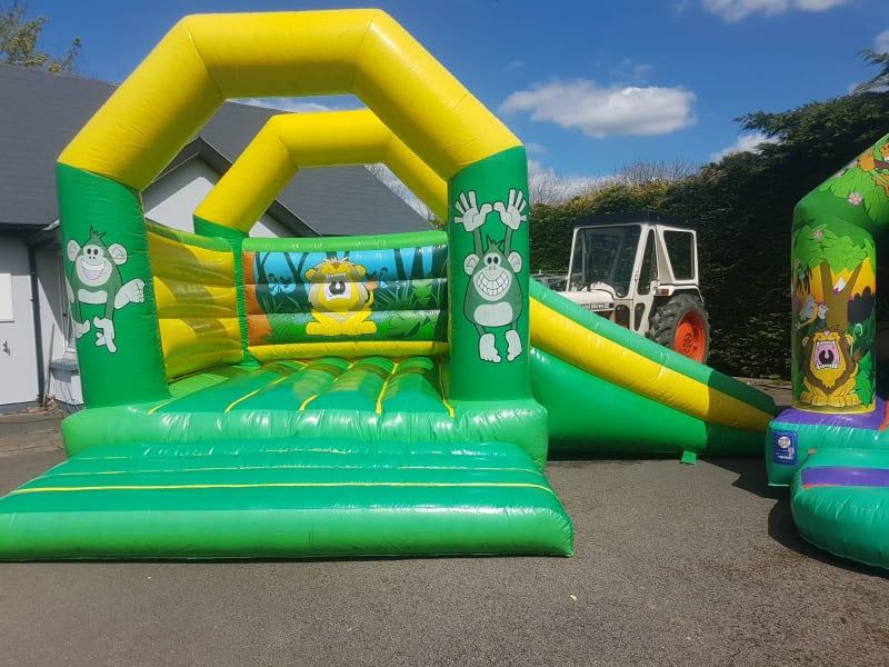 Jungle themed Castle with slide to the side. Perfect Castle to appeal to all ages with a neutral design for both boys and girls. Ideal for bigger gardens, nice high bouncy bed. This unit is not rain covered at present. Incredible 3D effect Jungle art-work which kids love. Highly Recommended.