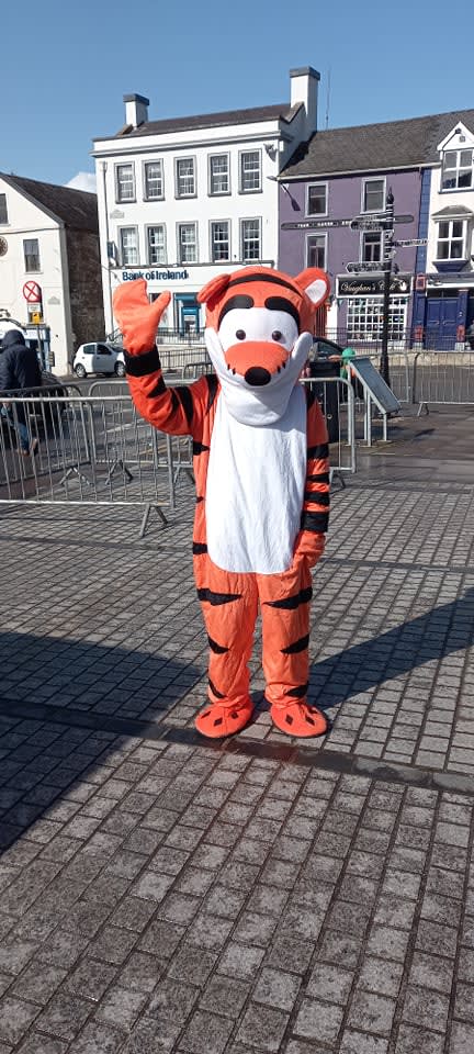 Orange and black striped plush velour zip-front jumpsuit .There is a tail on the back and a hood with tigers ears and face where your child looks out from under the tigers cute face