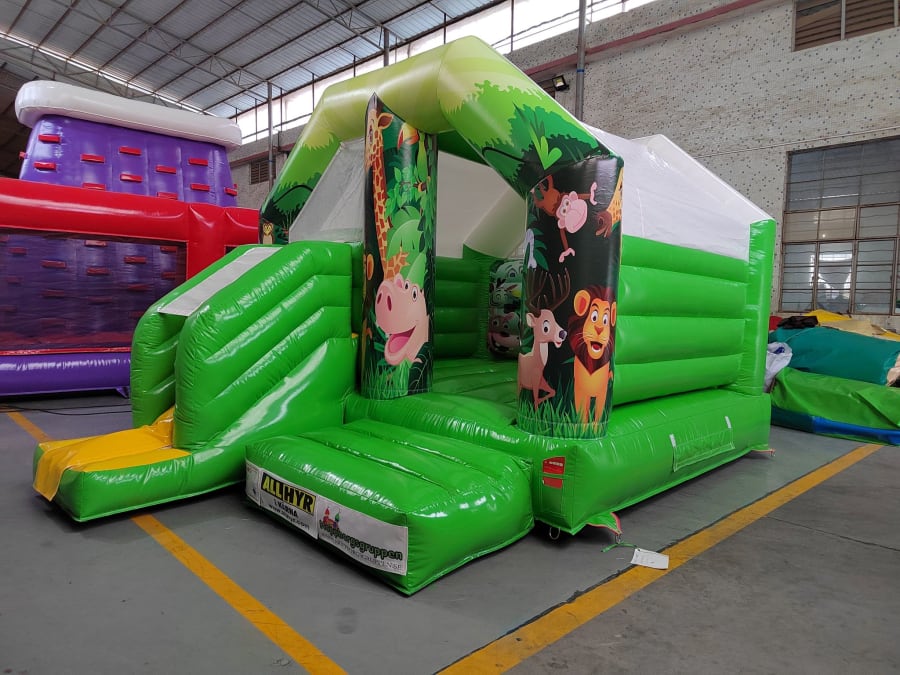 Brand new for 2022 - Jungle themed Bouncy Castle with front-slide. Perfect Castle to appeal to all ages with a neutral design for both boys and girls. Ideal for narrow gardens with limited space and indoor venues.