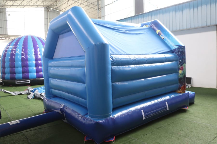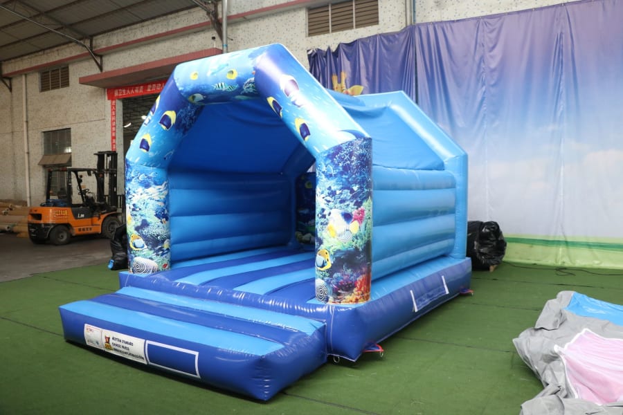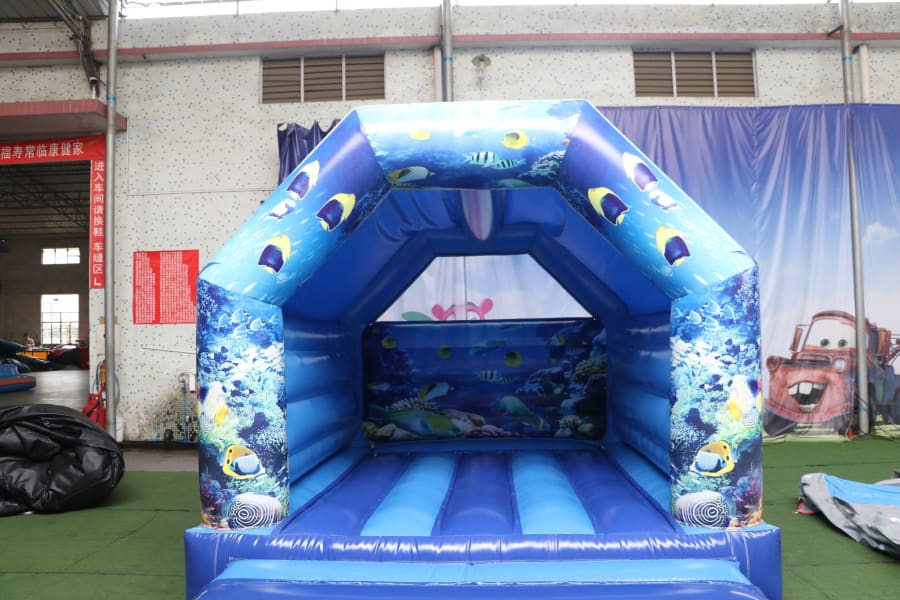 Gorgeous bouncy castle with SeaWorld theme. This roofed inflatable fits almost every backyard or driveway. Small easy to set up yet eye-catching inflatable. It has bright, Colorful artwork all created in a Fantastic Under the sea theme.