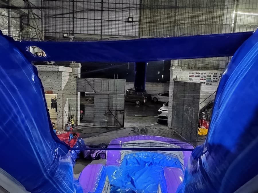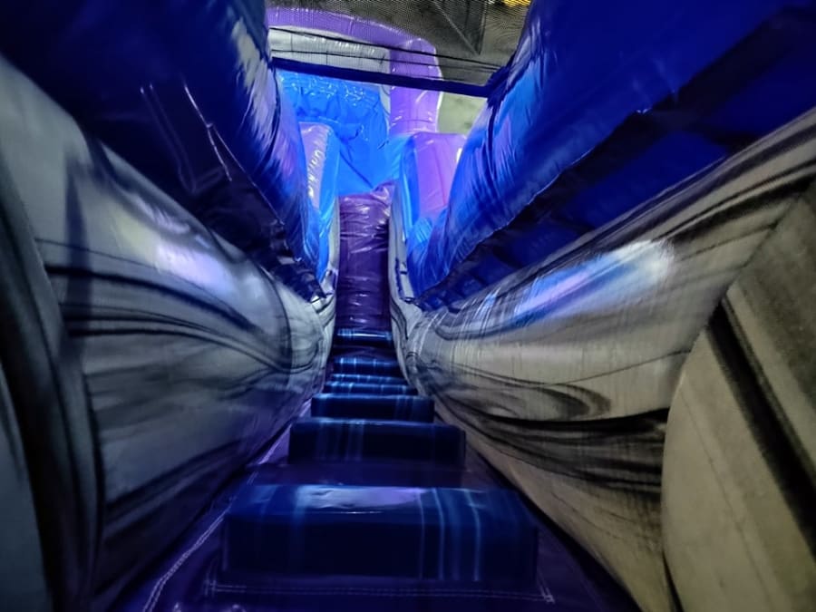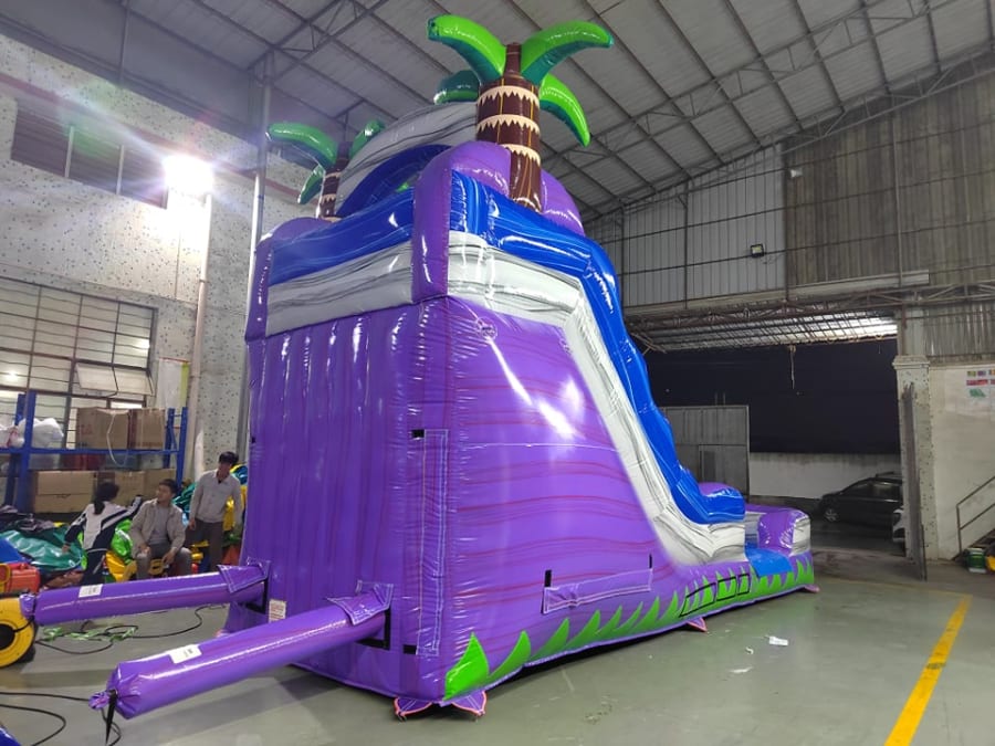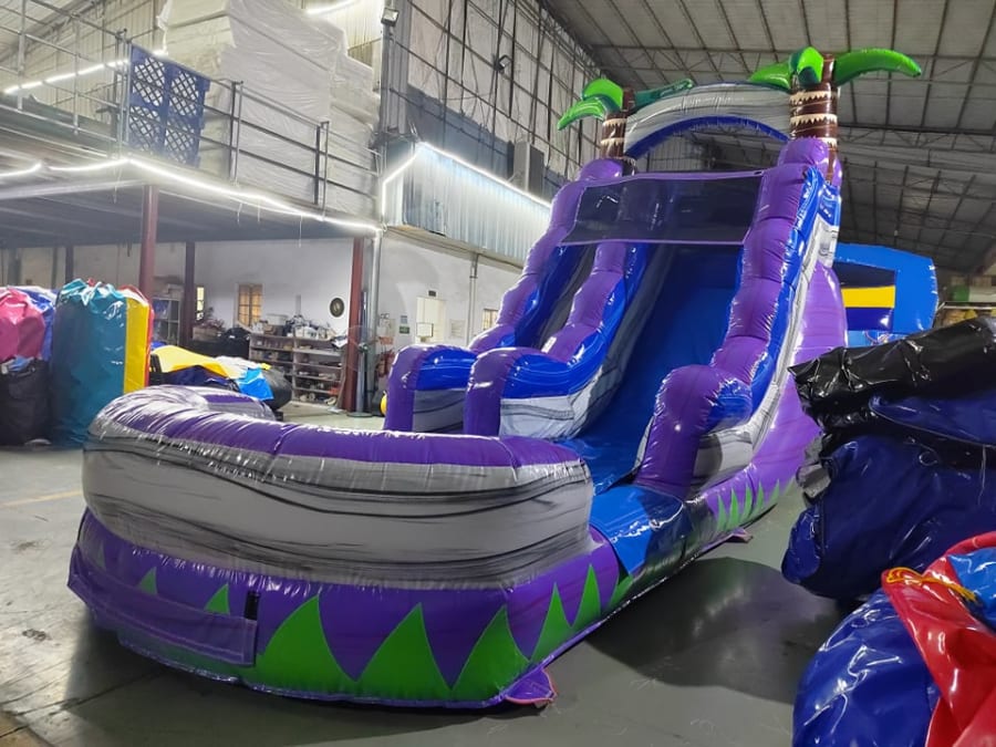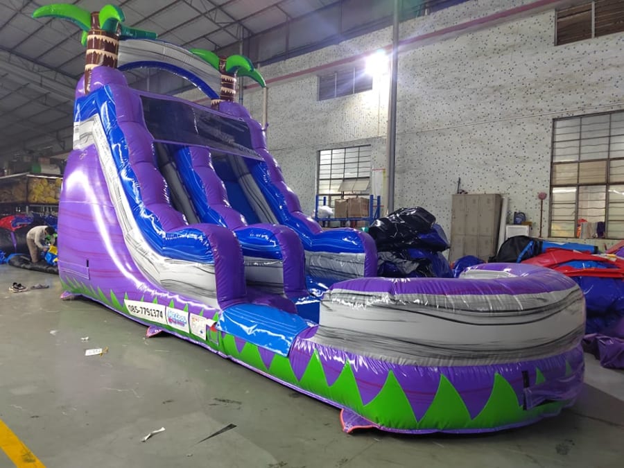 With its vibrant purple marble design, this waterslide is sure to catch the eye and create a tropical oasis in your backyard or event space. The slide stands at an impressive 15ft high, offering an exhilarating experience for both kids and adults alike.