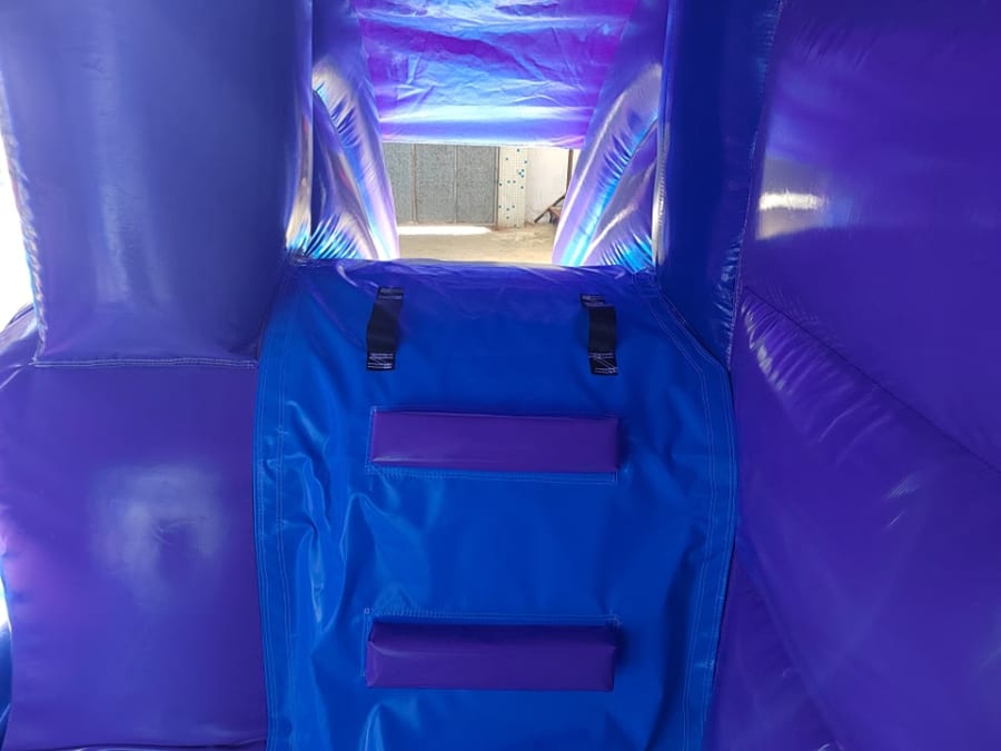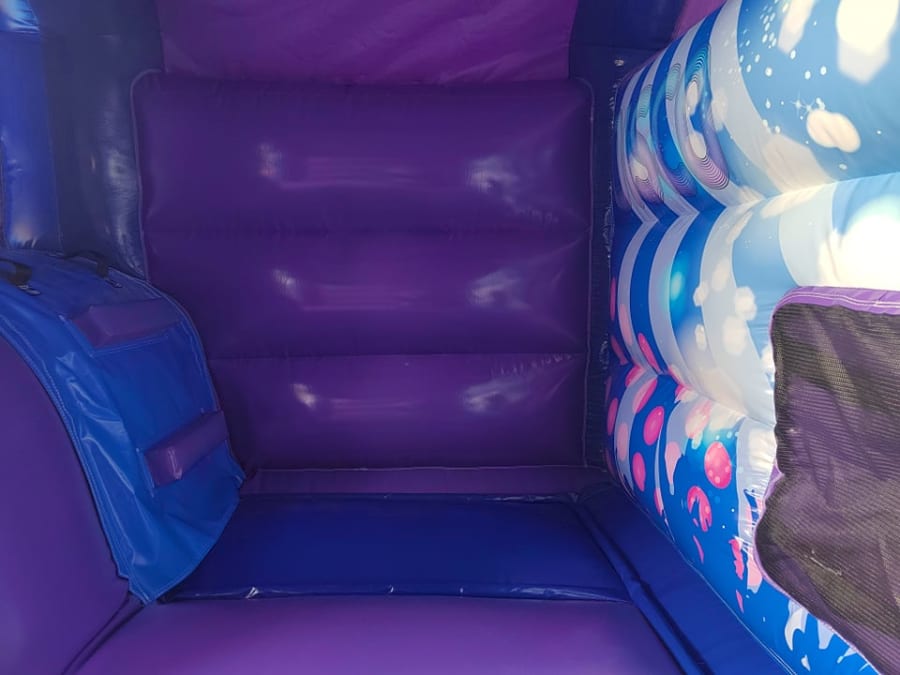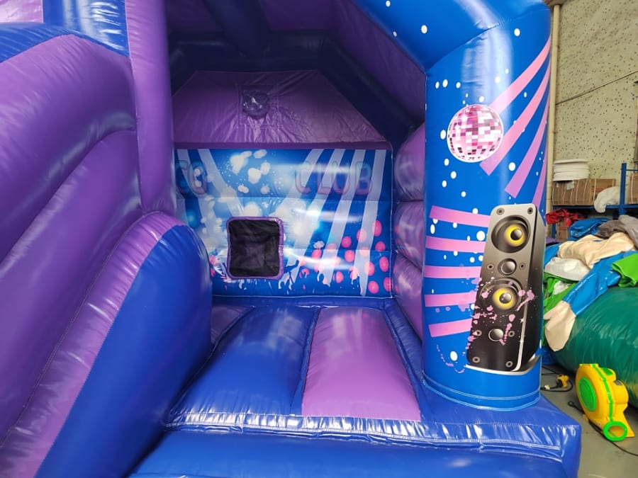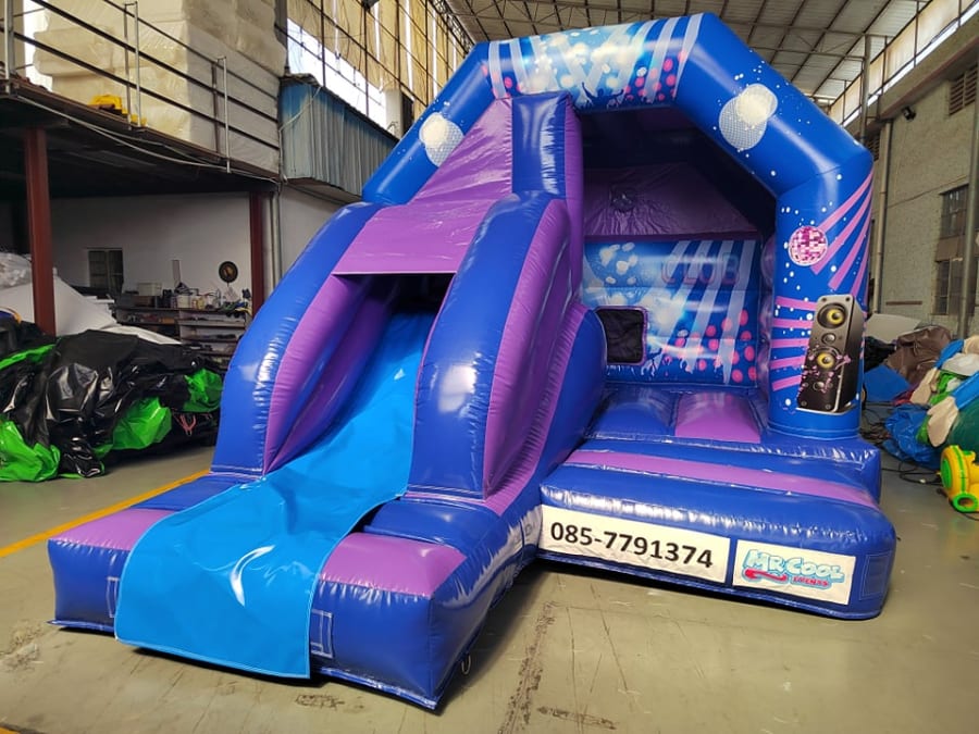 Mr Cool Events neat little Disco themed bouncer is a great castle it comes will speaker and lights , it has a nice big bouncy area and a slide out to the front and the footprint is a small 16ft x 12ft area so it will fit into most gardens.
