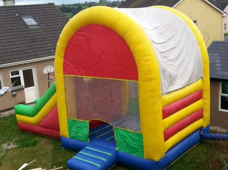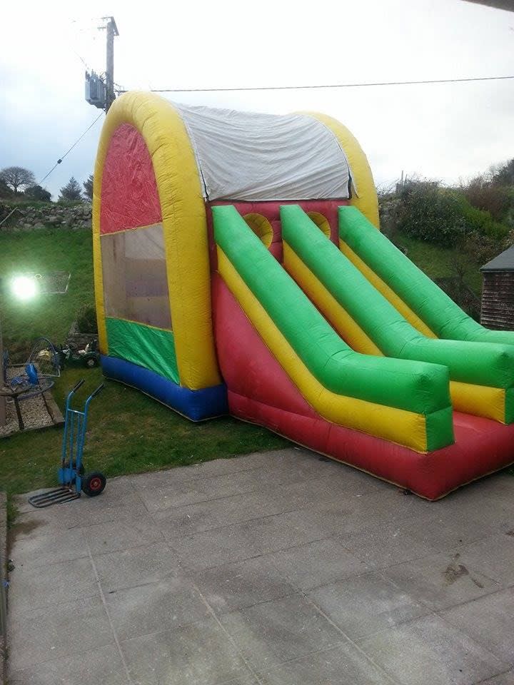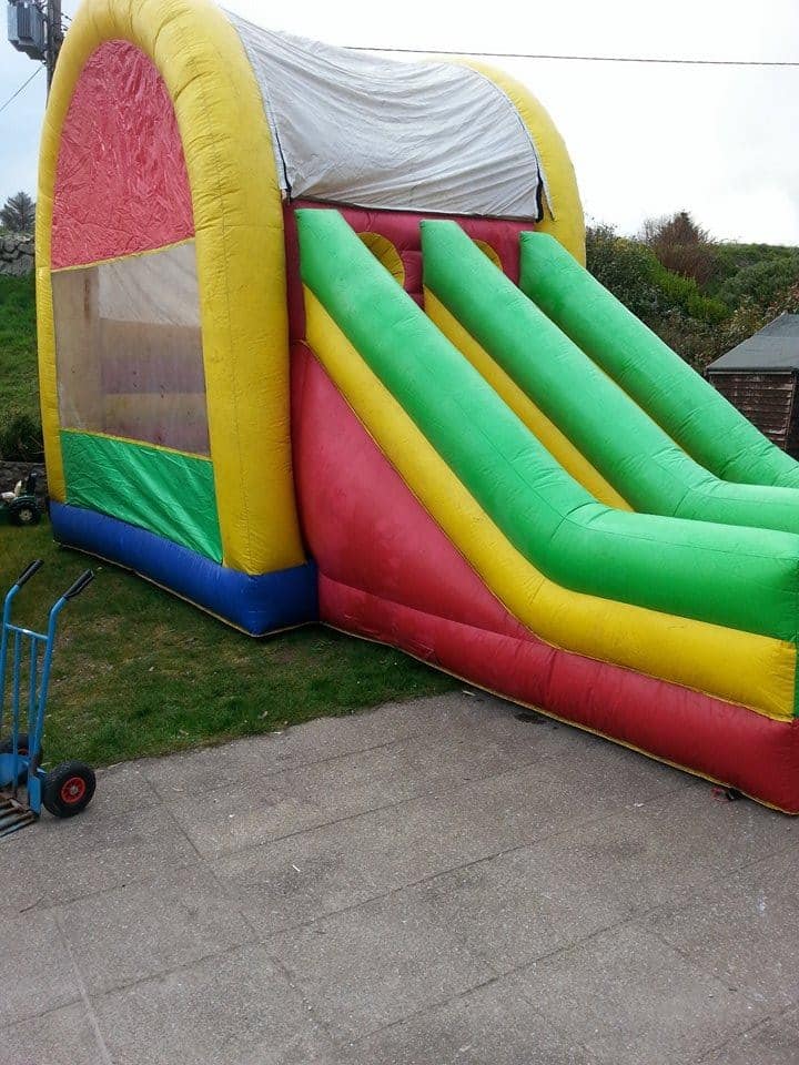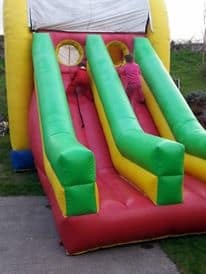 Large 20ft x 20ft unit with 12ft twin slide extending to the side. This unit has a climbing wall inside and a large bouncing area. Suitable for kids and adults it will provide endless hours of fun for all the family. Comes with raincover and safety mats..