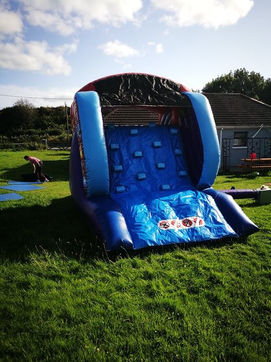 This bouncy slide has a full rain-cover and a cool vertical slide. Watch the smallies climb up the stepped climbing wall and roll down the other side all day long.