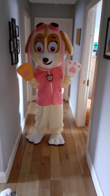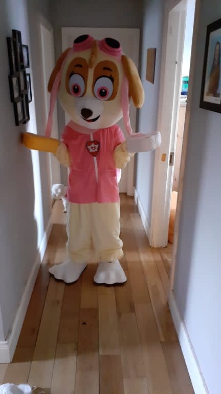 Paw Patrol mascot consists of a head, sculptured suit, mittens and two shoe covers.