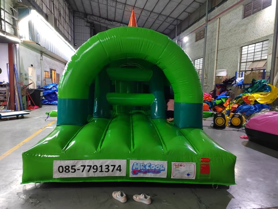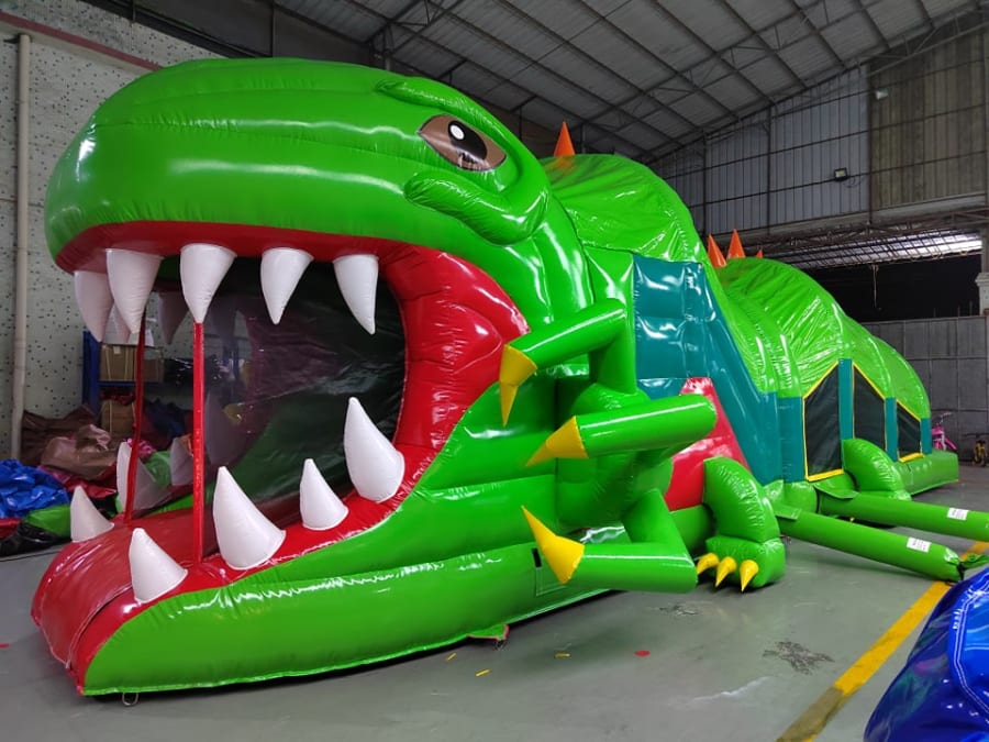 Wow your guests with this definite winner suitable for all ages and occasions. This green reptile obstacle course includes a dive through the tunnels, a fight through the bish-bash area, a scramble over the rock climbing wall and a shoot down the big slide to finish.