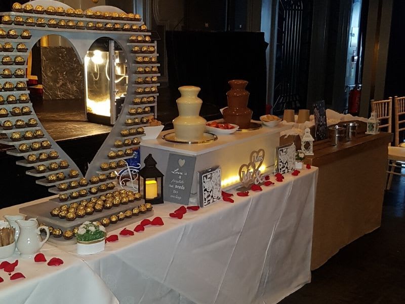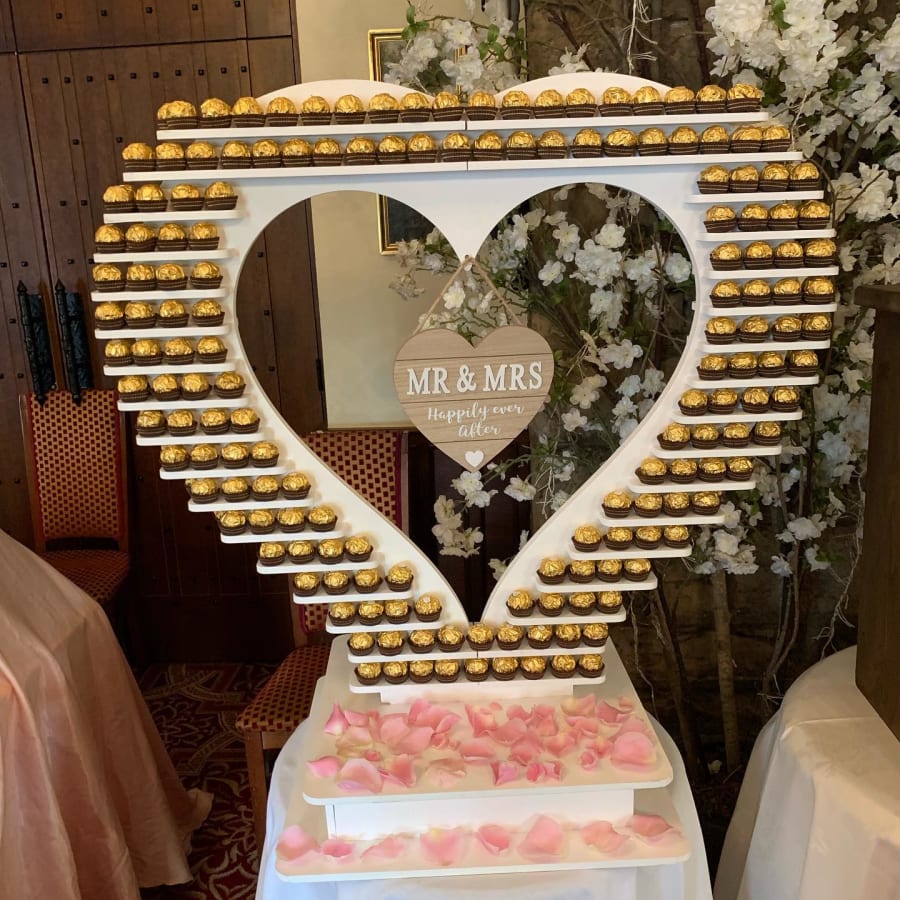 Mr Cool Events are happy to announce that our Ferrero Rocher Heart Stand is now available to hire for your special occasion , our Ferrero Rocher Stand will add an extra touch of elegance to your event and is a great value wedding favour .